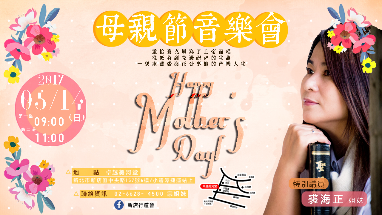 View Larger Image 母親節音樂會|裘海正的音樂人生 曾為飛鷹三姝的 #裘海正, 如何從生命的低谷到充滿祝福的生命? ❤️#母親節特別聚會❤️》 裘海正的音樂人生 5/14 09:00AM|11:00AM 歡迎您邀請家人、朋友, 一起到 #卓越美河堂 的感動現場, 看見生命無限的可能🙌! #請分享》把握每次的機會,這會是生命改變的時刻! #請按讚》讓我們一起去邀請家人朋友~ #請留言》我會來!你呢? 臉書連結 tomie2017-04-16T12:44:41+08:0016 4 月, 2017|最新消息, 活動資訊|0 Comments 請分享 FacebookXRedditLinkedInTumblrPinterestVkEmail Related Posts Top Kidz 三月活動 Gallery Top Kidz 三月活動 21 2 月, 2026 | 0 Comments 身心疾患怎麼伴 Gallery 身心疾患怎麼伴 13 2 月, 2026 | 0 Comments 2026領袖高峰會 Gallery 2026領袖高峰會 13 2 月, 2026 | 0 Comments 讚美之泉 x Top Kidz【兒童創意敬拜特會】 Gallery 讚美之泉 x Top Kidz【兒童創意敬拜特會】 6 2 月, 2026 | 0 Comments 新店行道會五十週年特會|從一粒種子到一片樹林 Gallery 新店行道會五十週年特會|從一粒種子到一片樹林 30 1 月, 2026 | 0 Comments 留言給我們 取消回覆留言 Save my name, email, and website in this browser for the next time I comment. Δ