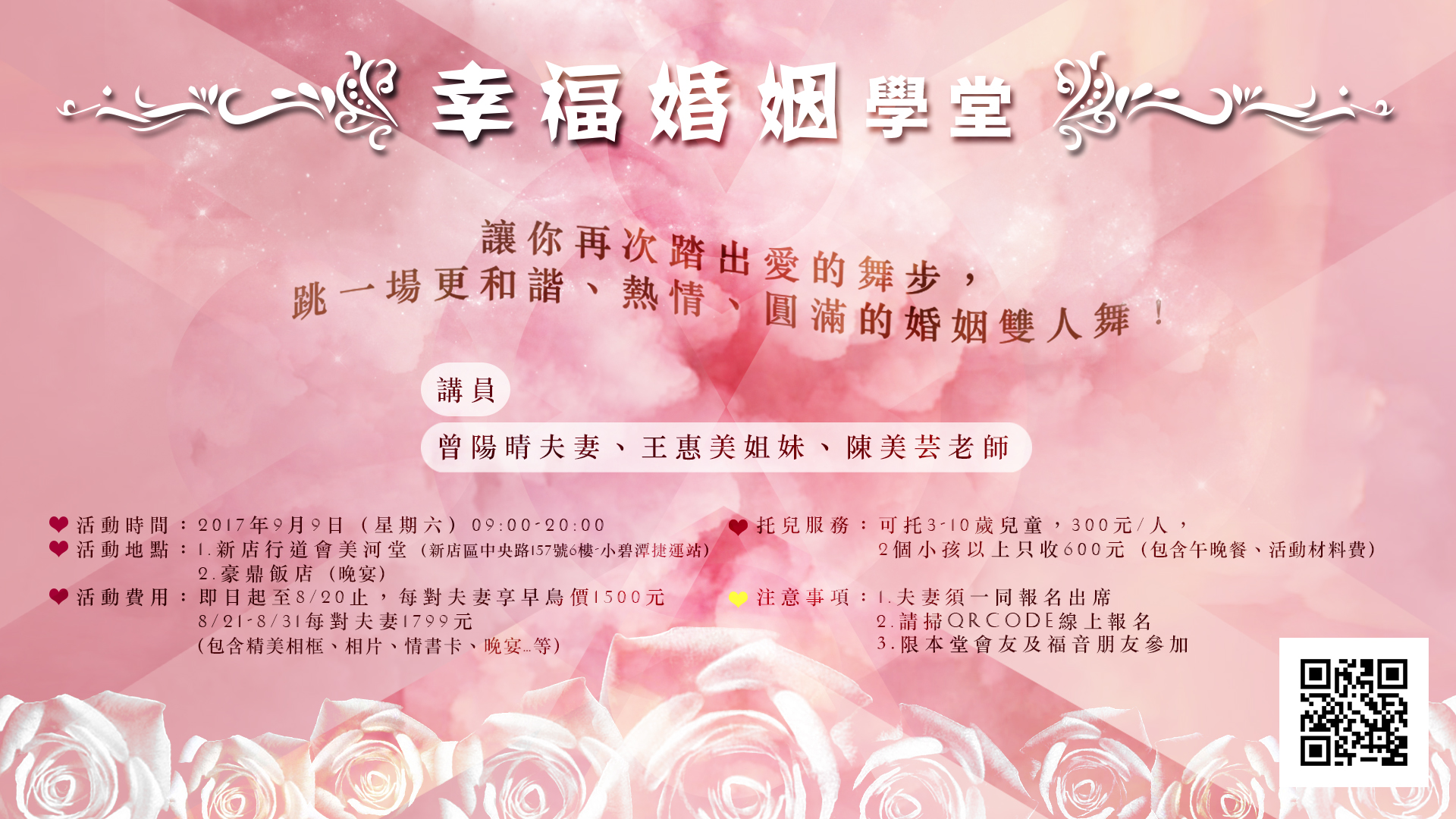 View Larger Image 幸福婚姻學堂|2017 婚姻祝福禮 不管你是新婚還是老夫老妻, 讓我們一起踏出愛的舞步,跳一場更和諧、熱情、圓滿的雙人舞! 幸福講員: 曾陽晴夫婦、王惠美姊妹、陳美芸老師 時間地點: 2017/9/9 09:00AM 卓越美河堂 晚上於豪鼎飯店北新店舉行晚宴 報名費: 每對夫妻 1799元 含相框、相片、特製小物、晚宴 托兒服務: 可托 3-10歲兒童,300元/人 兩個小孩以上只收600元 含午晚餐費、活動材料費 注意事項: 1.夫妻需一同參加 2.請掃QR CODE 線上報名 3.限本堂會友及福音朋友參加 我要報名 tomie2017-08-20T16:32:57+08:0020 8 月, 2017|最新消息, 活動資訊, 課程報名|0 Comments 請分享 FacebookXRedditLinkedInTumblrPinterestVkEmail Related Posts Top Kidz 三月活動 Gallery Top Kidz 三月活動 21 2 月, 2026 | 0 Comments 身心疾患怎麼伴 Gallery 身心疾患怎麼伴 13 2 月, 2026 | 0 Comments 2026領袖高峰會 Gallery 2026領袖高峰會 13 2 月, 2026 | 0 Comments 讚美之泉 x Top Kidz【兒童創意敬拜特會】 Gallery 讚美之泉 x Top Kidz【兒童創意敬拜特會】 6 2 月, 2026 | 0 Comments 新店行道會五十週年特會|從一粒種子到一片樹林 Gallery 新店行道會五十週年特會|從一粒種子到一片樹林 30 1 月, 2026 | 0 Comments 留言給我們 取消回覆留言 Save my name, email, and website in this browser for the next time I comment. Δ