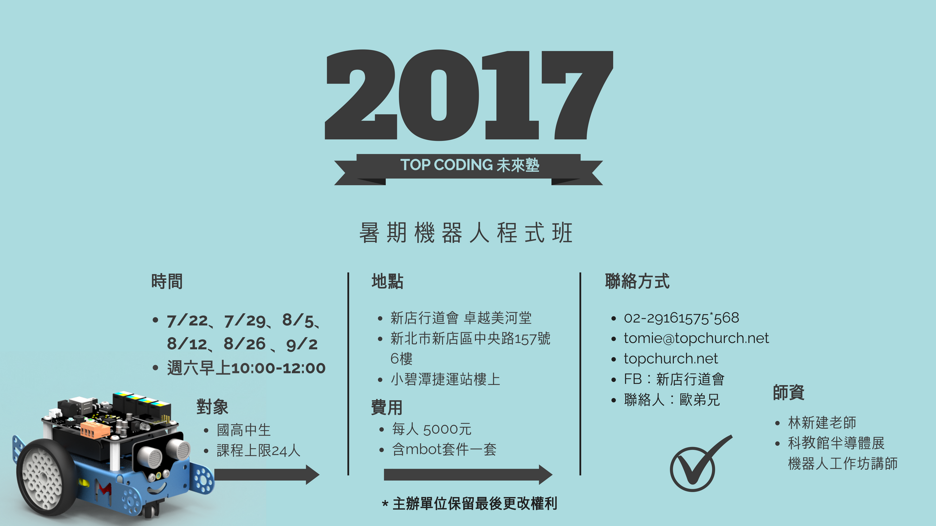 2017 暑期機器人程式班 Gallery 2017 暑期機器人程式班 最新消息, 課程報名 2017 暑期機器人程式班 tomie2017-05-18T16:05:38+08:0018 5 月, 2017|最新消息, 課程報名| 載入更多 0